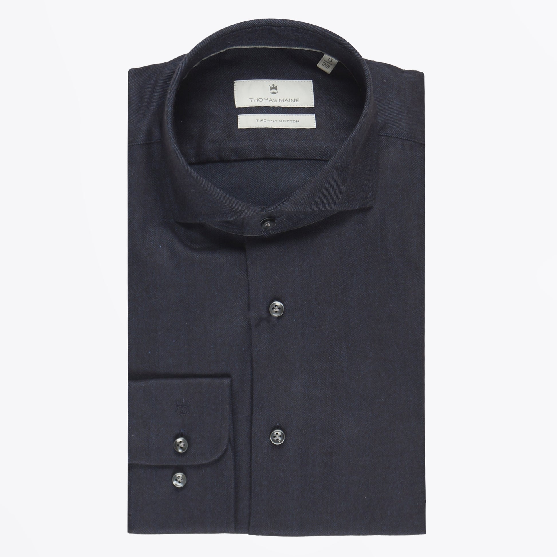 A classic yet contemporary brand, Thomas Maine is known for its sophisticated and masculine pieces. A great way to update your white shirt collection, this navy shirt is crafted using brushed cotton fabric, and features a collared neckline, navy mother of pearl button-up fastening, buttoned cuffs, and an embroidery of the Thomas Maine logo on the cuff in a navy thread. Wear this shirt under a smart jacket and with some MMX trousers for a great work look.