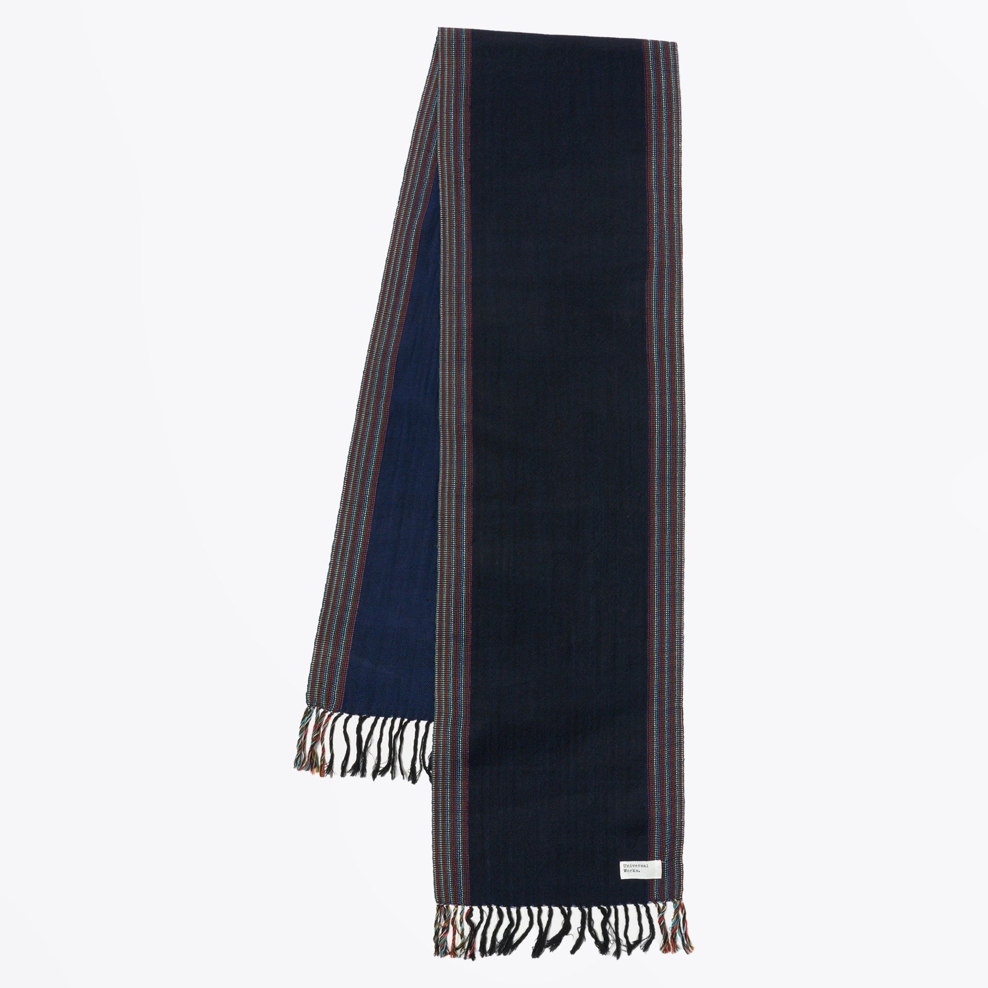 This British designer is a brand shaped by a deep appreciation of the musical and sporting subcultures that underpin the everyday life of British men. Universal Works takes its cultural and contextual heritage and layers it under a nuanced understanding of contemporary menswear needs. Adding contemporary to your style to your wardrobe this winter option. The scarf features a multicoloured border, tweed design and two toned primary navy colour palette, frilled hem and a logo patch. Wear this any of your favourite winter outfits.
