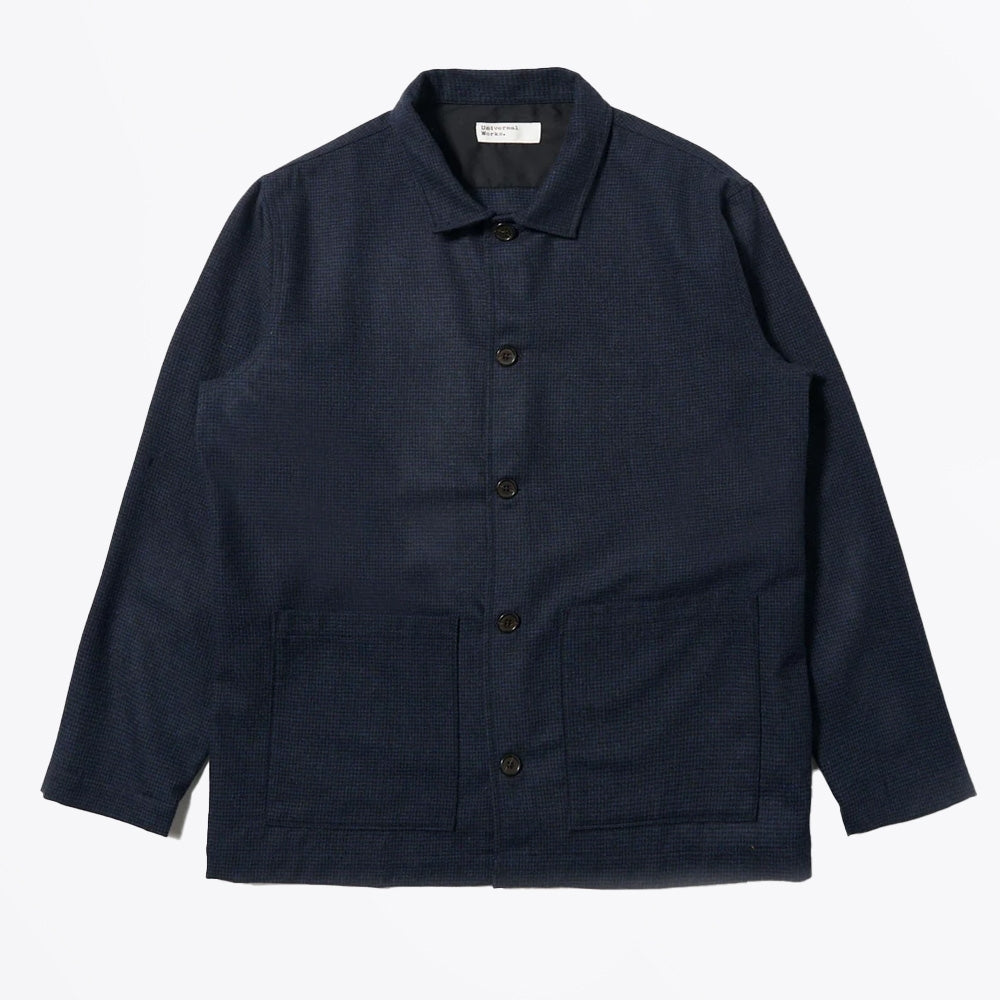 The Universal Works Easy Overshirt in Navy Brushed Bari offers a relaxed, unstructured silhouette, making it an ideal layering piece for various occasions. Crafted from a lightweight blend of 66% wool, 30% polyester, and 4% other fibres, the fabric is woven in a mini dogtooth check with a blue marl base, adding subtle visual texture. The overshirt features a button closure, two front patch pockets, a back yoke with twin pleats, and plain, unbuttoned cuffs for easy rolling. Made in Portugal, this piece combines utility with a contemporary aesthetic