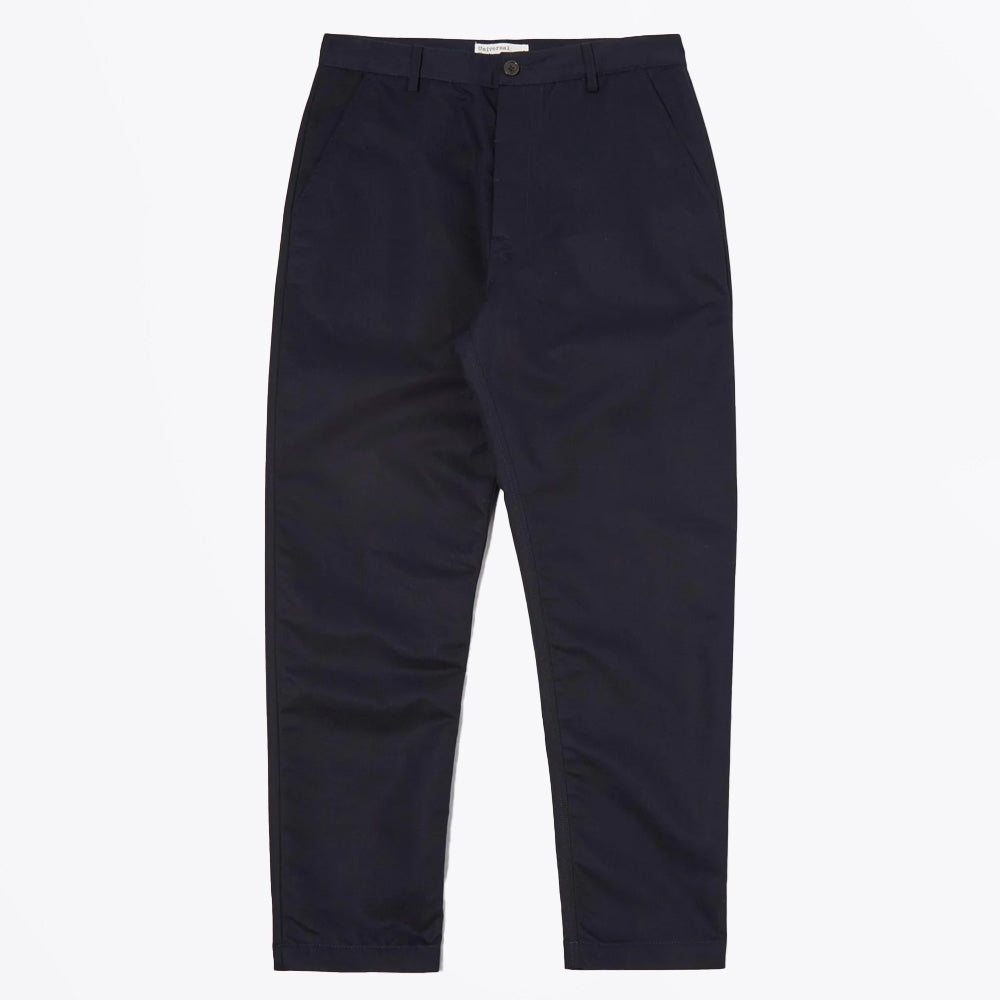 The Universal Works Military Chino in Navy Brushed Polytech blends utility and polish in a contemporary trouser you’ll reach for again and again. Made from a robust blend of 65% cotton and 35% recycled polyester, the brushed finish gives it a matte, “peachy” texture with a utilitarian edge. These chinos are clean through the hips and thighs, tapering toward the ankle for a sharp profile. Style them under boots or with sneakers; great for layering with overshirts or jackets. Mid-rise waist, button fly, classic front pockets, and rear jetted buttoned pockets combine function and form.