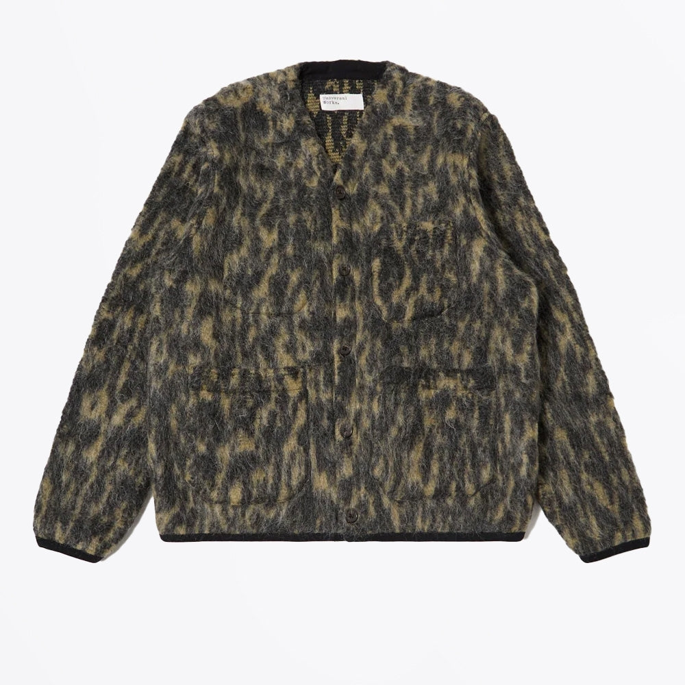 The Universal Works Cardigan in Charcoal Dolce Fleece is a timeless layering piece crafted from a blend of 15% recycled polyester, 15% polyester, 28% acrylic, 27% mohair, and 15% wool. The cardigan features a self-bound button front, a curved V-neck collar, and five button closures. It offers three outer patch pockets and an additional inside pocket, providing ample storage. The cotton rib-bound cuffs and hem add to the comfort and structure of the cardigan. With a regular fit, it's ideal for layering over shirts or under jackets during cooler months.