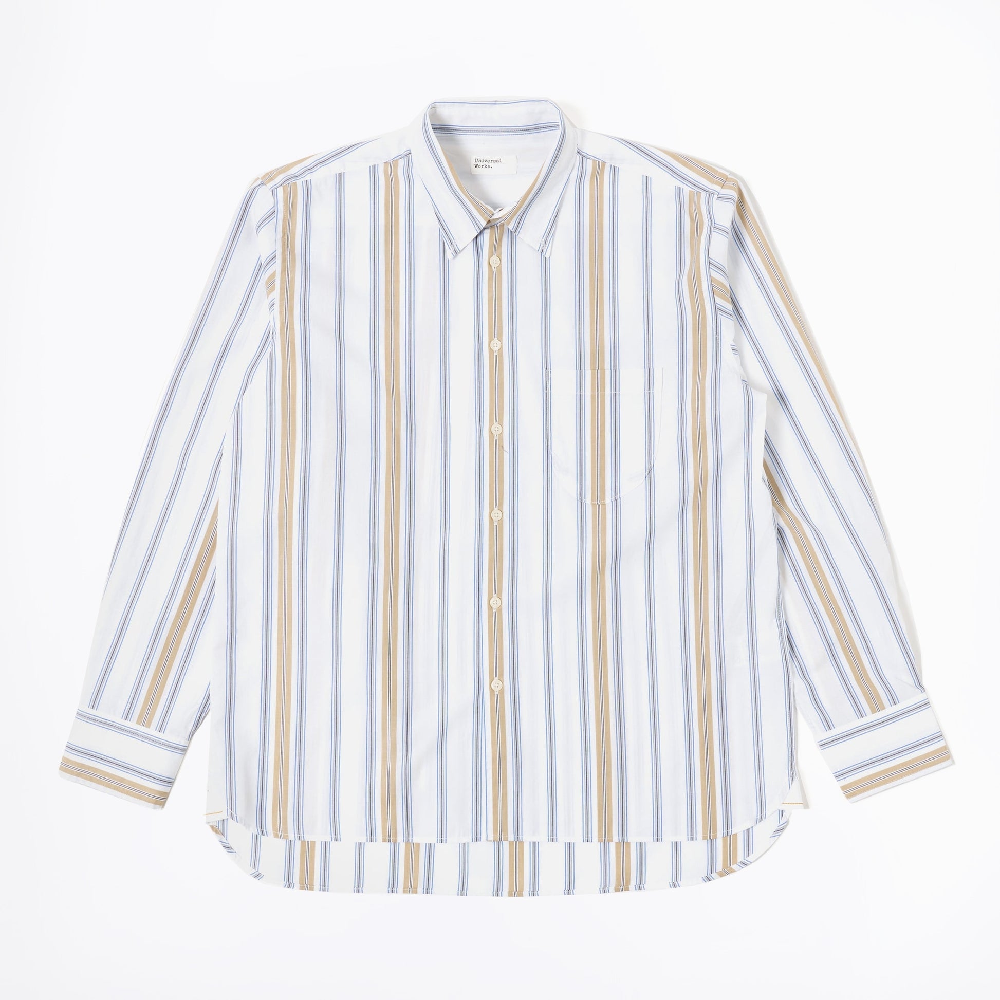 This British designer is a brand shaped by a deep appreciation of the musical and sporting subcultures that underpin the everyday life of British men. Universal Works takes its cultural and contextual heritage and layers it under a nuanced understanding of contemporary menswear needs. Adding contemporary to your style to your wardrobe this summer with this shirt. The shirt features a blue/Sand pop stripe throughout, collared neckline, chest pocket, button up fastening, back pleat and buttoned cuffs. Wear this with some Oliver Spencer trousers and Hoff sneakers.