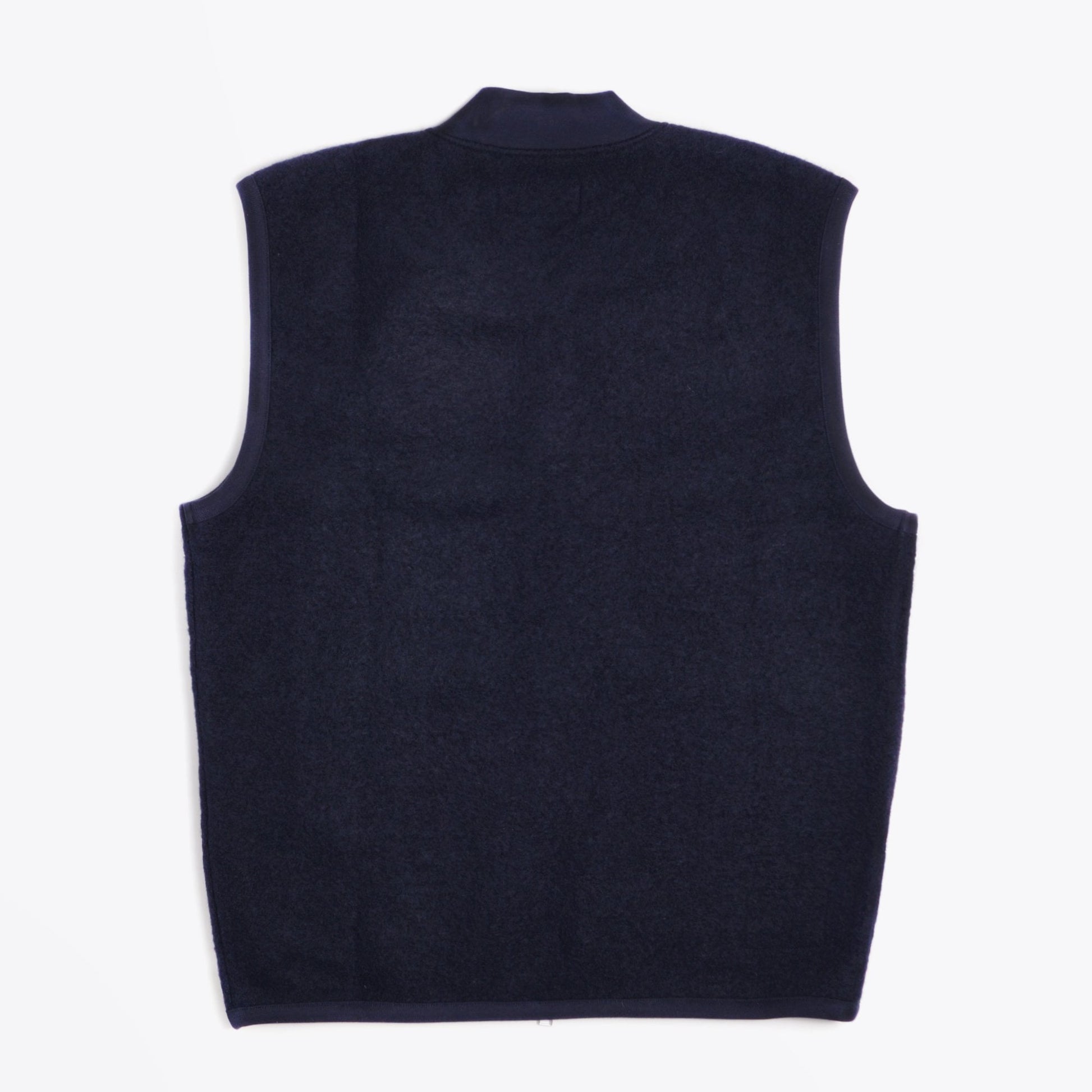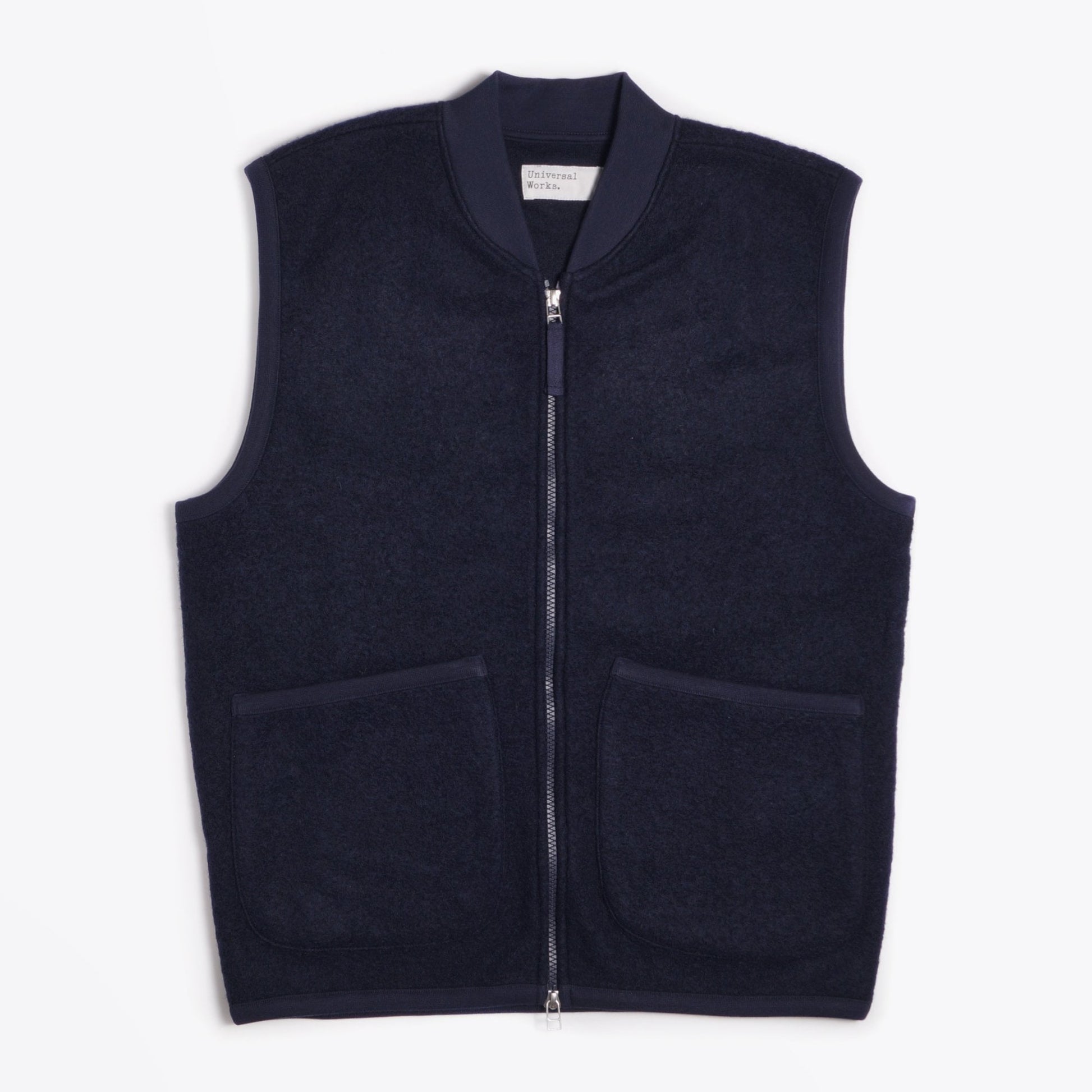 Introducing one of our newest labels, Universal Works to Mr & Mrs Stitch. This British designer is a brand shaped by a deep appreciation of the musical and sporting subcultures that underpin the everyday life of British men. Universal Works takes its cultural and contextual heritage and layers it under a nuanced understanding of contemporary menswear needs. This classic fleece zip waistcoat is constructed in a wool blend with a soft handle. This style of waistcoat is the perfect example of unstructured tailoring and features double zip opening and two lower patch pockets. This waistcoat has also got an elasticated navy trim detail around the neckline, arm holes and waistline. This item is versatile enough to suit all occasions.