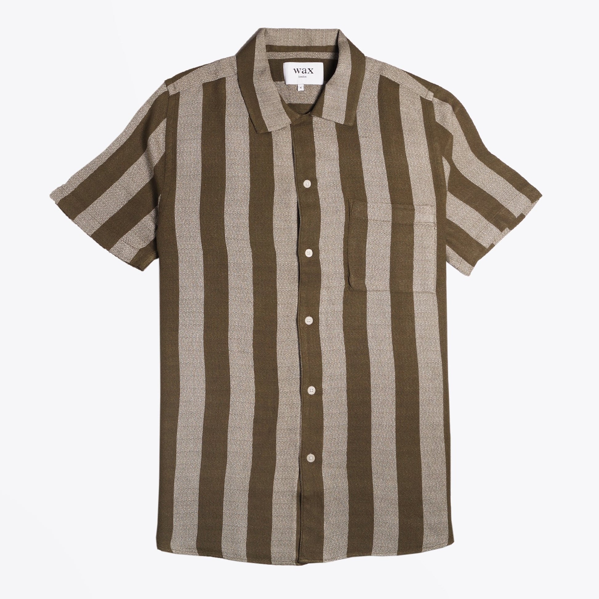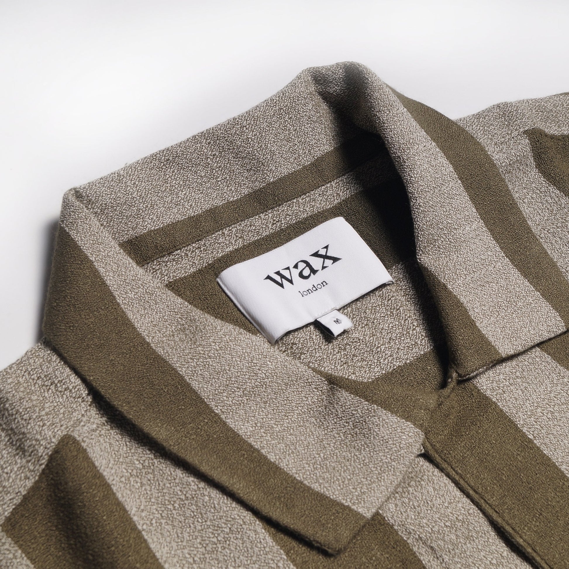 One of our newest labels, Wax London was founded with a dedication to create premium menswear with sustainability at its core. The brand aims to bring the manufacturing of British outerwear back to the UK. Wax London sources the most sustainably produced fabrics, using natural dyeing techniques, manufacturing closer to home and donating profits to charity. Taking retro cues from mens summer shirts of the 1950s, the Fazely shirt is a short-sleeved number that will see you through the hot weather in style. Cut from a lightweight cotton blend with a green tonal stripe, this shirt features a cuban-style collar, one chest patch pocket, top button loop opening and button down front with eco-friendly corozo nut buttons. This style of shirt has a great handle and drape and can be layered over a white tee with chinos and sneakers. The perfect transitional piece!