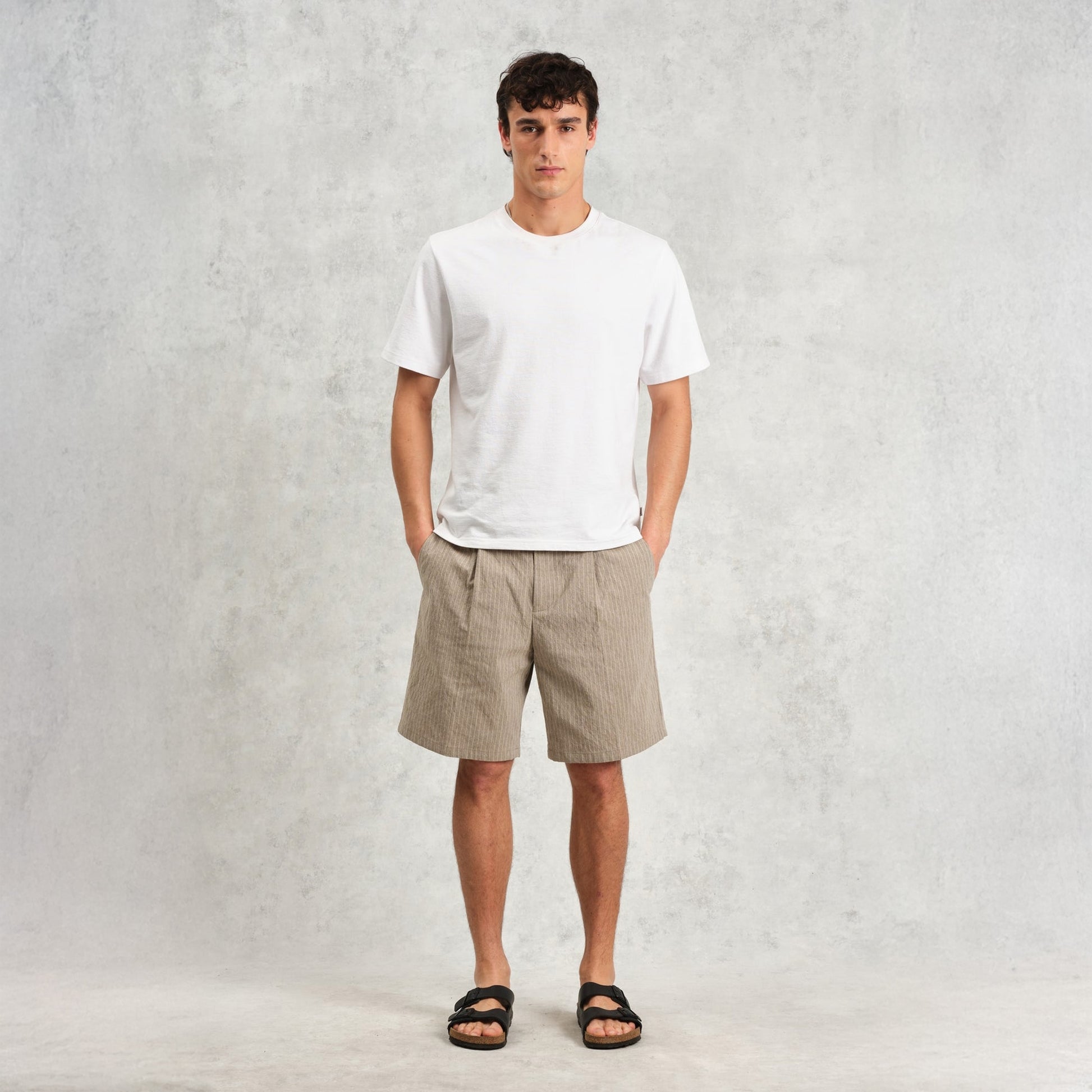 Back for SS25, the Linton Shorts are your ultimate summer go-to. Cut for a classic straight leg with a single front pleat detail, these shorts are crafted from a cotton blend with high-twist yarn, giving them a unique crinkle texture. The natural colorway is beautifully accented with a subtle light beige chalk stripe, adding a refined touch to this laid-back essential.