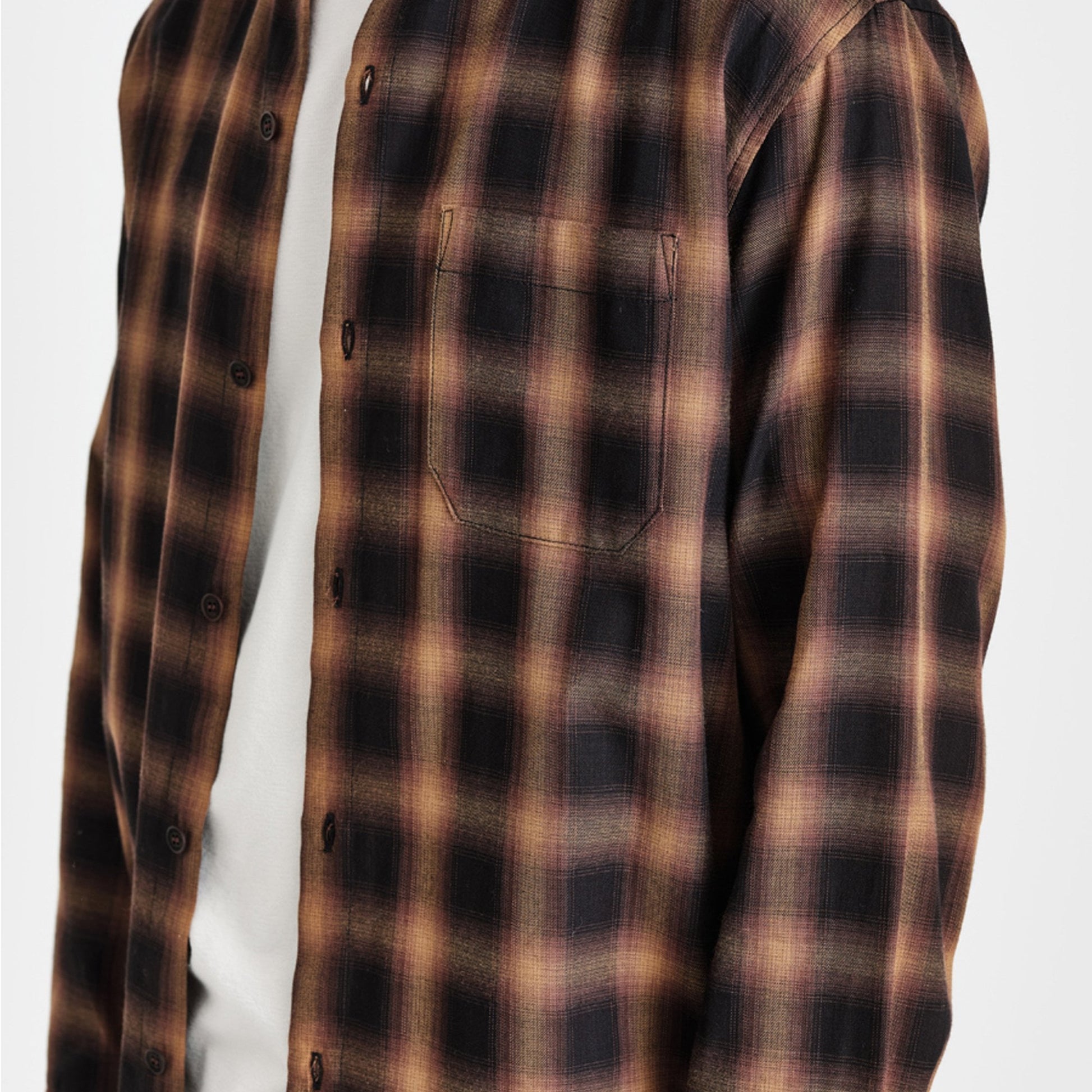 Wax London was founded with a dedication to create premium menswear with sustainability at its core. The brand aims to bring the manufacturing of British outerwear back to the UK. Wax London sources the most sustainably produced fabrics, using natural dyeing techniques, manufacturing closer to home, and donating profits to charity.  Add a touch of designer luxury to your casual shirt collection this season. This shirt is crafted with an ombre check pattern in brown and black shades, and feature a button-down fastening, a collared neckline, and a patch breast pocket. Wear this shirt over a Wax London basic tee and with some Nudie Jeans.