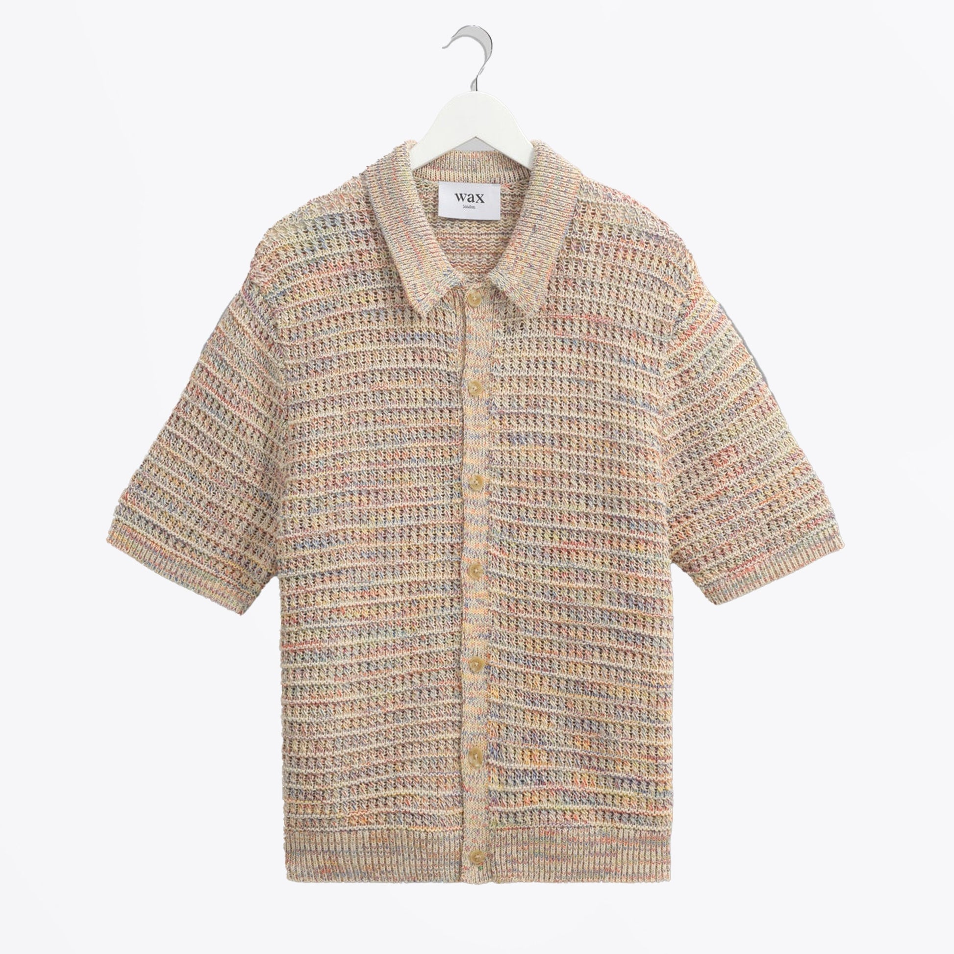 Our short-sleeve button-through Tellaro Polo returns for SS25 with a fresh design update. This new version retains its relaxed fit and ribbed sleeve cuffs, hem, and collar, while being crafted from a midweight twisted irregular multicolor space-dyed yarn. The slightly open knit construction adds texture and breathability, making it the perfect addition to your spring and summer wardrobe.