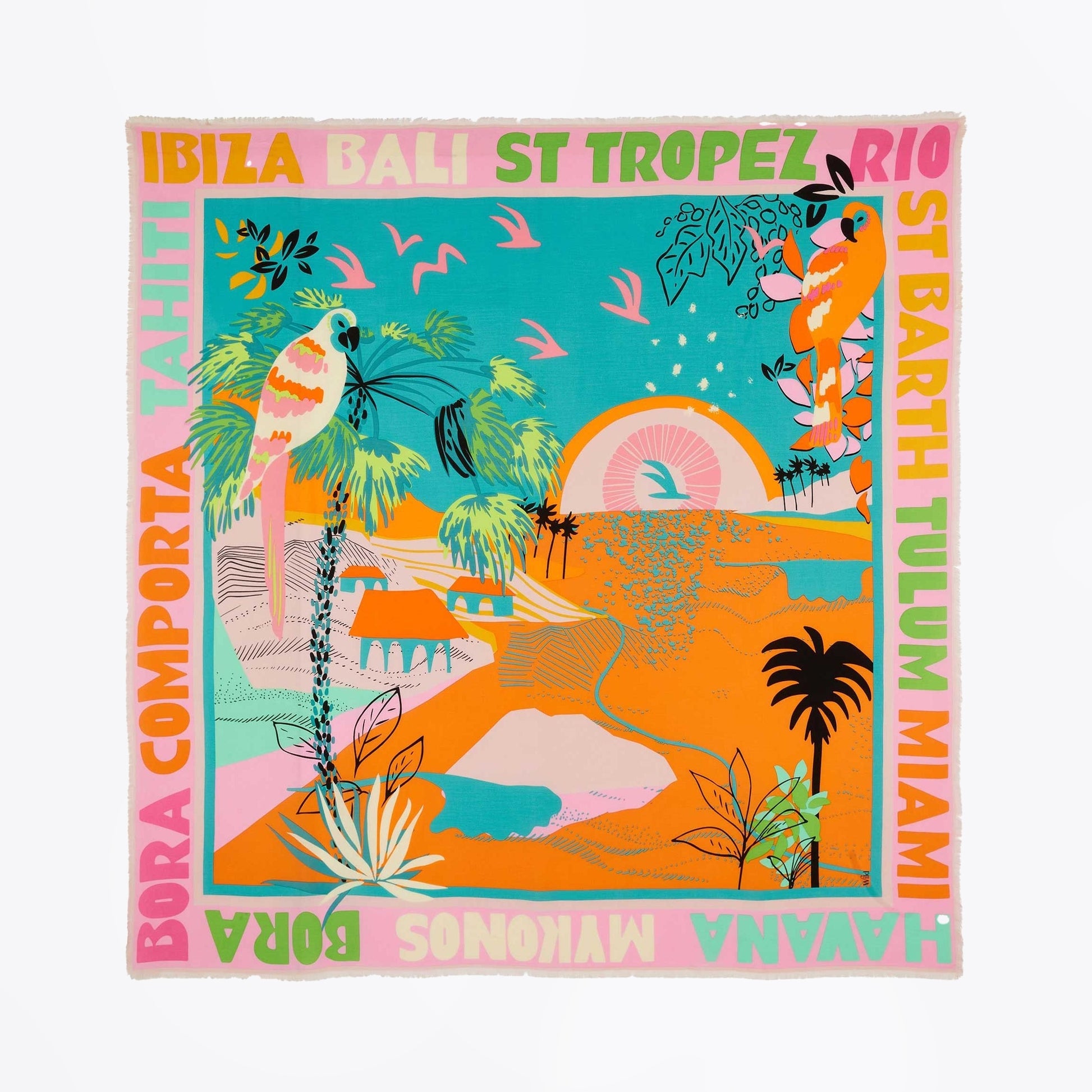 Emanating the intoxicating Brazilian spirit, the brand Wild celebrates the joy and freedom that certain dress offers to women. Their pieces all feature unique prints and motifs, with joyful colours and feminine silhouettes. Adding fun colour to your accessories, this beautiful scarf features a sunset beach print in surreal colours, with animal motifs, and paradise destinastion texts on the border. This scarf is the perfect accessory to add colour to any outfit.