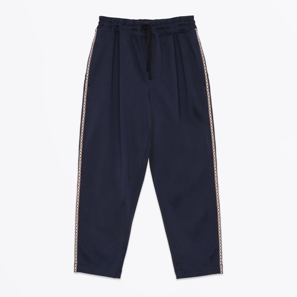 Introducing one of our newest labels, YMC - You Must Create to Mr & Mrs Stitch. This London label was founded in 1995 and has established itself as one of the most enduring and influential independent brands to come out of the UK. Initially inspired by workwear and military clothing, the founders developed the unisex brand around the notion of creating understated and timeless garments. Today, YMC continues to subvert expectations while simultaneously capturing the cultural zeitgeist. Named after revolutionary pro-skater and musician Tony Alva, the Alva pants draw inspiration from the icon’s signature slacker style. Designed in a soft-touch doubleface jersey fabric, these trousers have a multicolour woven tape trim side seams. A loose-fitting trouser with a slightly tapered cropped leg, key features of these trousers include an elasticated waistband with self fabric drawcord creating an adjustable waistband and ruched waist. They also have an inverted V-back yoke seam with back patch pocket and contrast fabric loop detailing. Mock J stitch fly.