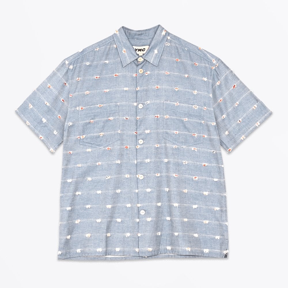 Introducing one of our newest labels, YMC - You Must Create to Mr & Mrs Stitch. This London label was founded in 1995 and has established itself as one of the most enduring and influential independent brands to come out of the UK. Initially inspired by workwear and military clothing, the founders developed the unisex brand around the notion of creating understated and timeless garments. Today, YMC continues to subvert expectations while simultaneously capturing the cultural zeitgeist. Designed in a soft and lightweight cotton fabric this shirt has been crafted with a delicate embroidered tuft texture. Relaxed fitting across the shoulders and over the frame with a regular length. Key features of this shirt include two self fabric front patch pockets with corozo button front fastening. This short sleeve shirt is a subtle, but unique, update to the classic summer shirt.