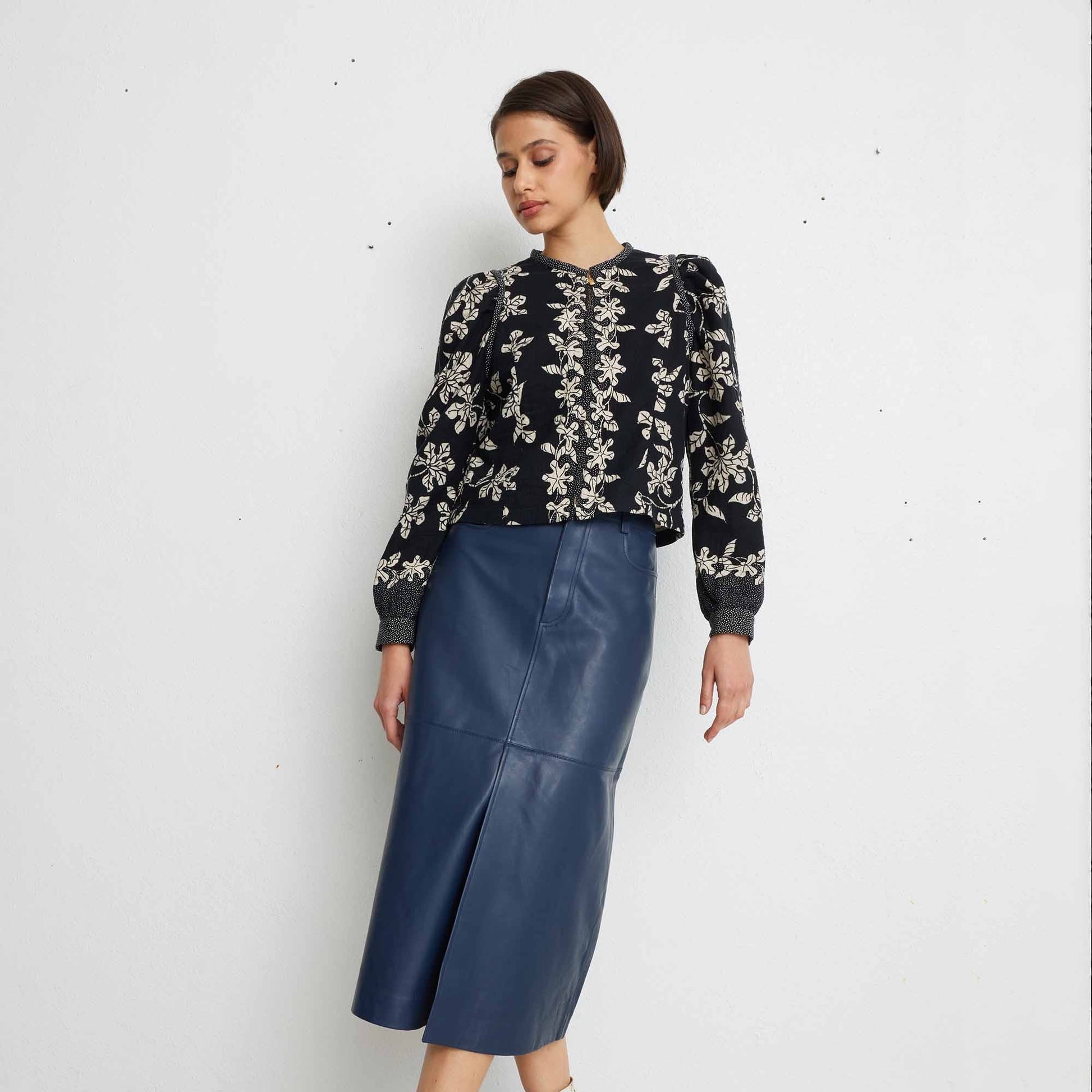Born through the collaboration of a renowned fashion workshop and an enthusiastic designer, Idano is known for bringing Parisian ready-to-wear to the rest of the world. Idano pride themselves on their selectiveness with their materials and their ability to create on trend clothes, that ooze personality and uniqueness. Incorporate pattern and effortless style into your winter wardrobe with this option from Idano. This jacket features a botanical inspired print in off-white and black, with front zip fastening, gathered shoulders, spotted cuffs, and a piped neckline. Wear this jacket over an American Vintage top and with some designer denim.