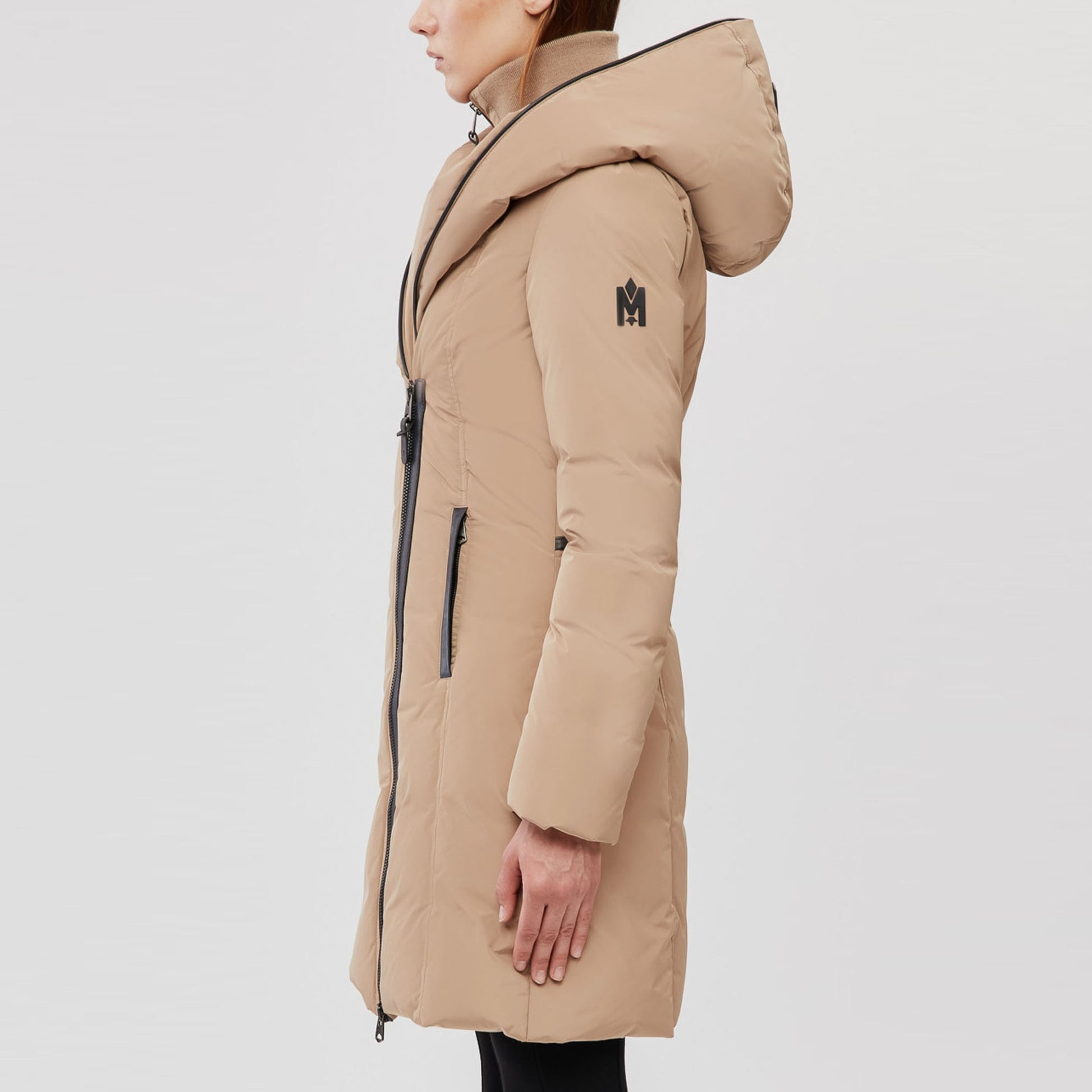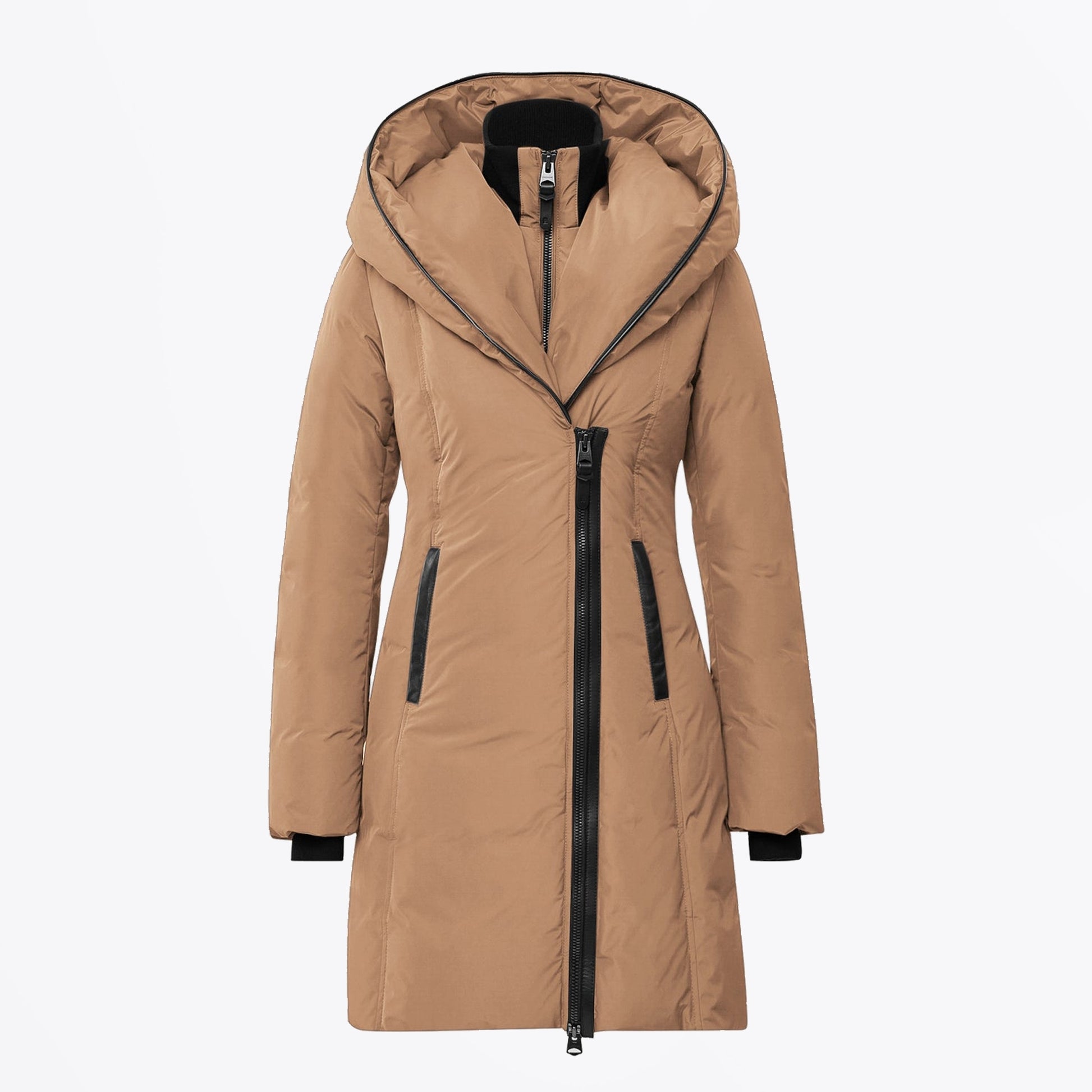 “Cold never looked this good” is Mackage’s motto and never has it been so true for a brand.  Designing ultimate outerwear that offers comfort, warmth and protection, these coats become the outfit itself.  This Kay no fur mid length fitted winter down coat in camel with signature collar has a multilayer system that ensures breathability and protection from the exterior elements.  Acting as a shield, this coat even has fleeced pocketing for extra warmth.  Not only making this a standout piece, the signature Mackage  hood protects the face and ribbed storm cuffs locks in the warmth. Additional features of this stunning coat include an inner bib with ribbed collar, leather welt pockets with zipper and an additional inside zippered pocket. Finished with ethically sourced superior down and an asymmetrical closure, this coat is an investment piece that will last a lifetime.