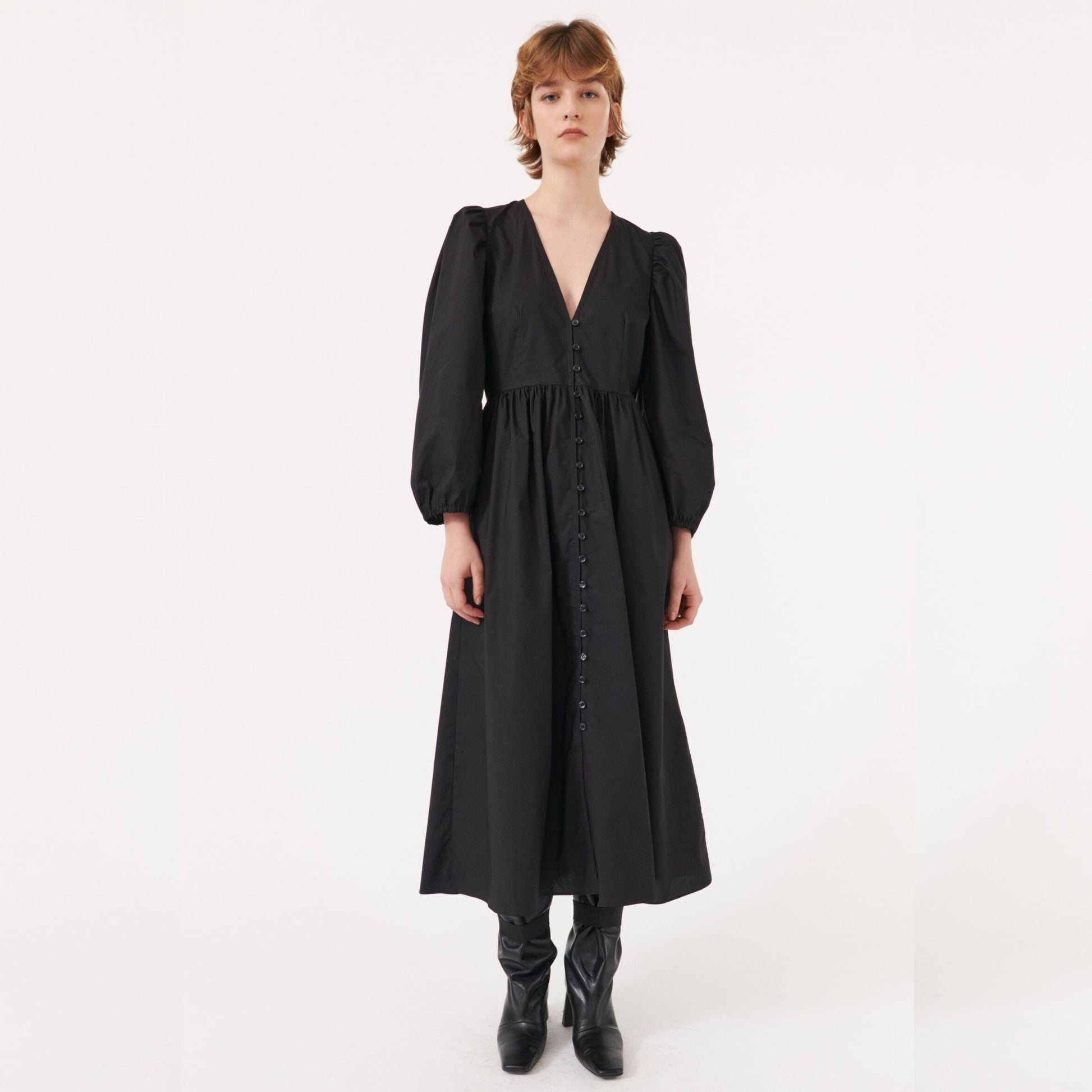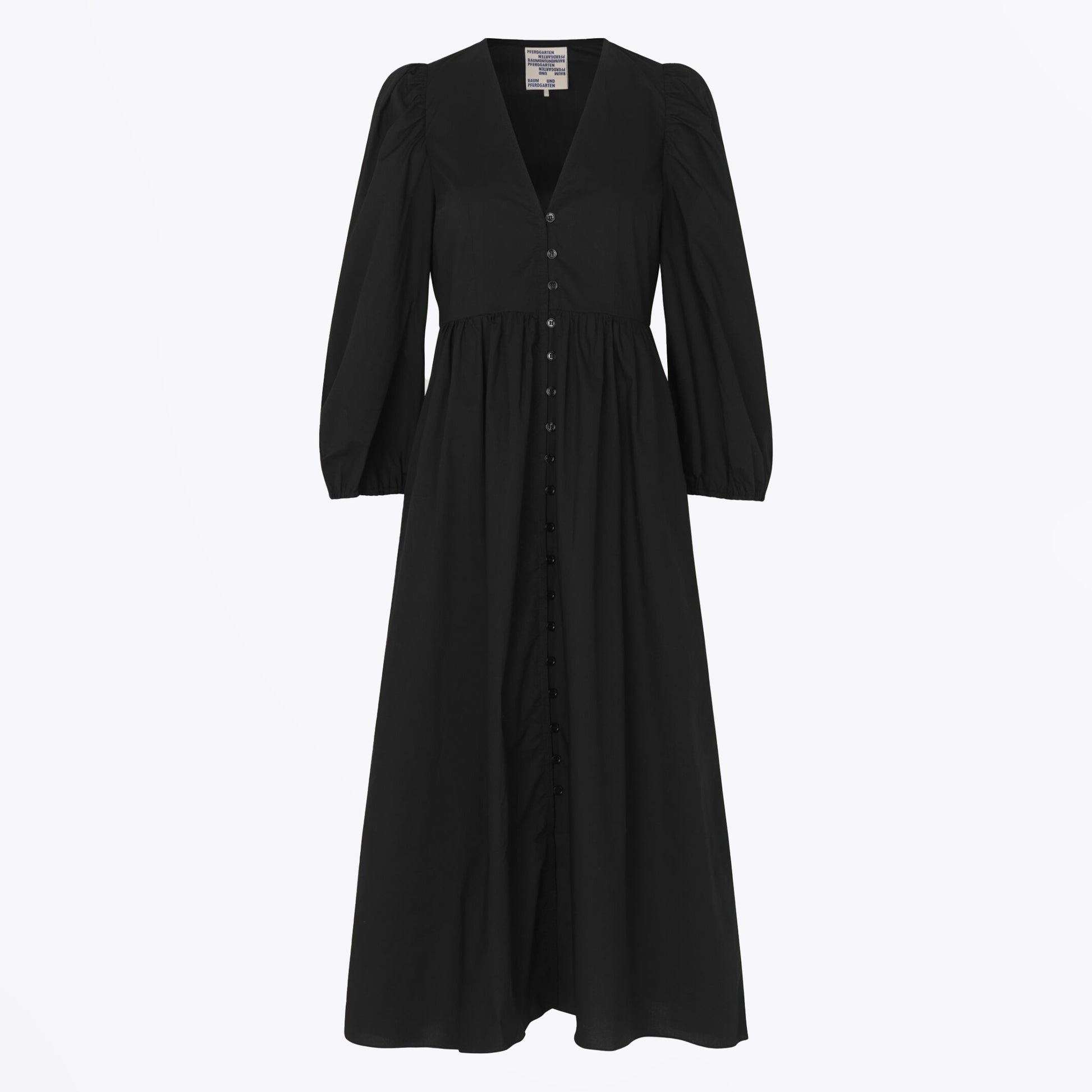 Baum und Pferdgarten is a Copenhagen-based label known for coveted collections embodying an ageless and exclusive approach to clothing and producing beautiful materials, bold colours, and striking prints. Add some great print to your new season wardrobe with this midi dress. Featuring a striking black organic cotton,, this dress has puffy sleeves with elasticated cuffs, a v-neckline, and a front covered button fastening. This dress also has pockets! Wear this dress with a pair of designer trainers to style down, or with a simple black heel for a great dinner date look.