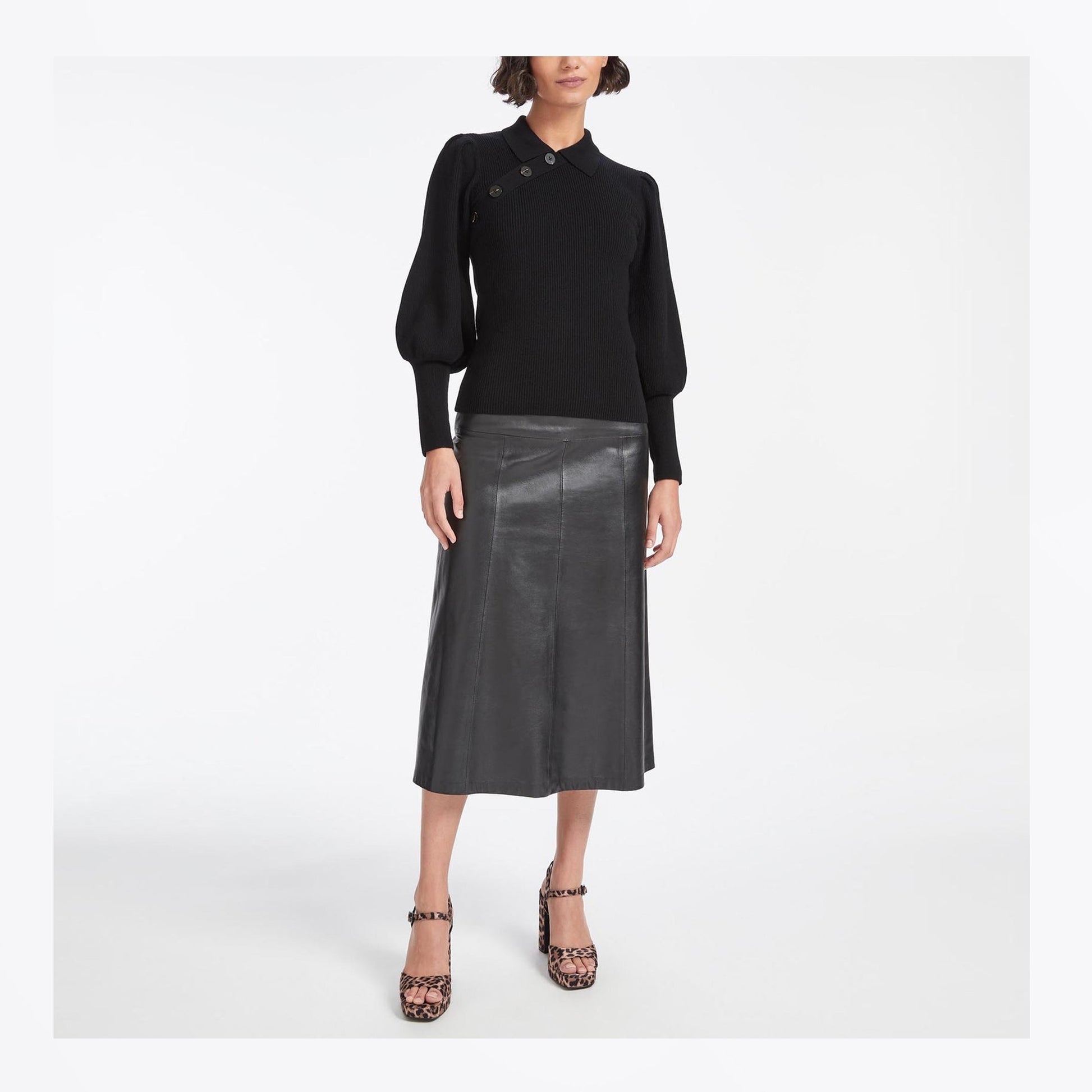 Modern design steeped in elegance and femininity, Cefinn’s contemporary style is all about creating unique pieces that are versatile and eternal. Founded by Samantha Cameron in 2017, this young brand has been designing clothing that allows women to feel effortlessly fashionable. Elevate your knitwear with a luxury yarn and contemporary style. Crafted from a merino wool, this top features bell sleeves, with a collared neckline with an asymmetric placket, and ribbed cuffs. Style this top with the Cefinn leather skirt and some strappy heels.