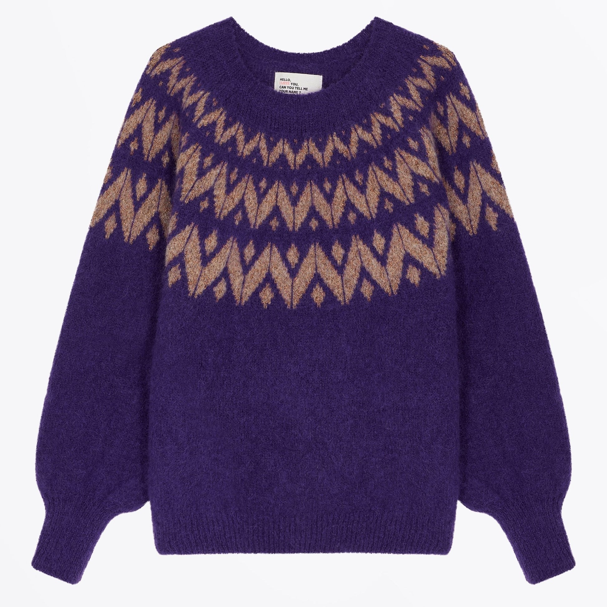 Leon & Harper is a firm favourite at Mr & Mrs Stitch. Created in Paris in 2010 by Philippe Corbin, Leon & Harper has rapidly implanted itself into the wardrobes of free-spirited young women through its timeless basics with their unique sense of detail. Leon & Harper creates fashion that is stylish and loose, designed for free movement and subtle seduction. This two-tone purple/gold jaquard knit is crafted in a mohair blend fabric providing ultimate warmth and the perfect all-year-round piece. This sweater has been designed with long sleeves and metallic jacquard detailing