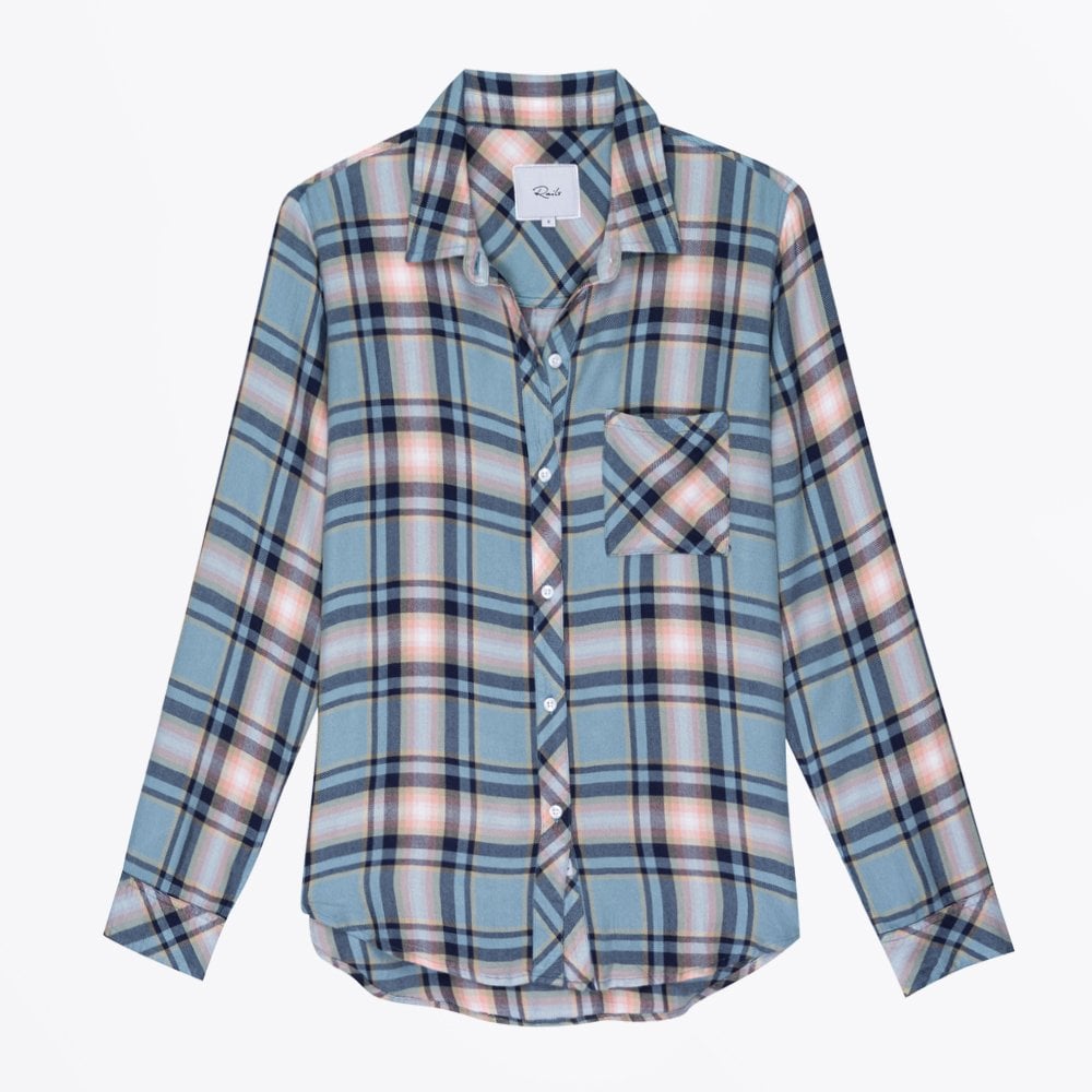 Relaxed and refined label, Rails is synonymous with accessible luxury by using premium fabrications in classic silhouettes, and has quickly evolved into a global lifestyle brand. Classic, long sleeve, button-down shirt with plaid design. Crafted from an ultra soft rayon fabric featuring a loose twill weave, this style of shirt is a year-round comfort classic with navy, pink, and warm peach plaid on a soft teal base. Single layer with one chest pocket.